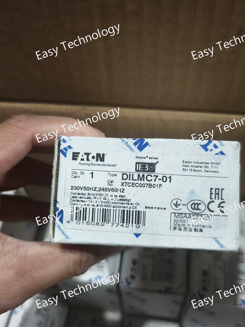Technical Parameters Parameter Specification Model DILMC7-01 Rated Operational Current (Ie) 7 A (at AC-3, 400V) Motor Power Rating (at 400V AC) 3 kW Rated Operational Voltage (Ue) 690 V AC Control Supply Voltage See note below* Number of Poles 3 main poles Auxiliary Contacts 1 NO (normally open) Utilization Category AC-3 (squirrel cage motors) Mechanical Durability 10 million operations Electrical Durability 1.5 million operations (at AC-3) Mounting DIN Rail (35mm) or Panel Mount Terminal Type Cage Clamp Protection Degree IP20 Standards & Approvals IEC/EN 60947-4-1, UL 508, CE, cULus