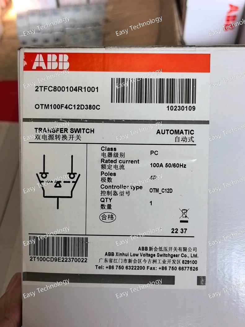 Technical Parameters Specification Typical Value / Description Product Type Automatic Transfer Switch (ATS) / Motorized Change‑Over Switch Model OTM100F4C10D380C Number of Poles 4 poles (three phases + neutral) Rated Operational Current 100 A Rated Operational Voltage Low‑voltage AC three‑phase (typically up to ~690 V) Control / Motor Supply Voltage 380 V AC Rated Insulation Voltage (Ui) Up to ~800–1000 V AC Impulse Withstand Voltage (Uimp) Several kilovolts Transition Type Open transition change‑over Operating Modes Automatic (motorized) and Manual (handle) Mechanical Interlock Prevents simultaneous connection of both sources Mounting Panel or enclosure mount Typical Applications Automatic transfer between utility and backup power in industrial/commercial systems