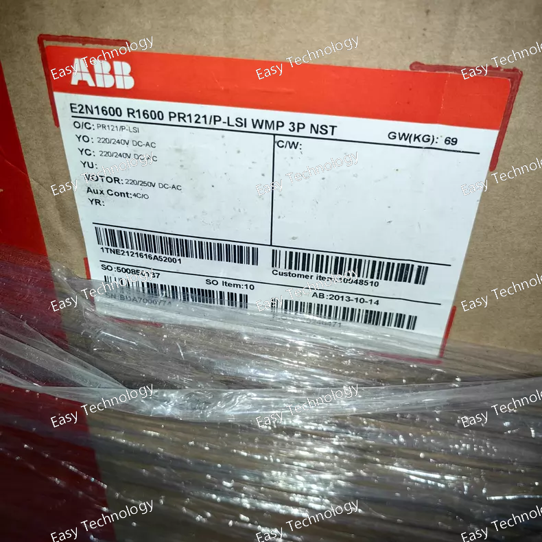 Technical Parameters Parameter Description / Value Product Series Emax (First Generation - E1) Breaker Type Air Circuit Breaker (ACB), Fixed Version Frame Size E1N (1600A Frame) Rated Current (Ir) 1600 A (Fixed setting) Rated Operational Voltage (Ue) Up to 690 V AC Breaking Capacity Category Normal (N) Ultimate Breaking Capacity (Icu) Typically 50 kA @ 415V AC (Example for E1N frame. Must be verified from catalogue for exact voltage). Service Breaking Capacity (Ics) Typically 50 kA @ 415V AC (Ics = Icu for Category N). Trip Unit PR121/P - Electronic, Basic version. Protection Functions L (Fixed Overload), I (Fixed Instantaneous). NOT INCLUDED: S (Short-time), G (Ground Fault). Number of Poles 3 Poles (3P) Communication The basic PR121/P-LI unit typically has no built-in communication ports. For communication, an upgraded trip unit (e.g., PR121/P-LSI with communication module) would be required. Control Voltage Requires an external auxiliary power supply (e.g., 24-48V DC or 110-230V AC) for the trip unit and spring charging motor. Standard IEC 60947-2