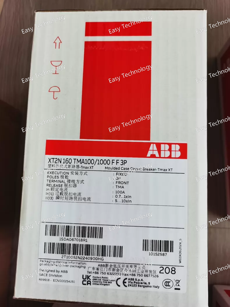 Parameter Specification Product Series / Range XT Series Molded-Case Circuit Breakers Frame Size XT2 Rated Frame Current (Iu) 160 A Rated Ultimate Breaking Capacity (Icu @ 400V AC) N-type: Typically 50 kA (Please confirm with official XT2N data sheet). L/H versions have different ratings. Number of Poles 3 Poles (3P) Trip Unit Type Electronic Trip Unit - TMA (or TMA-LSI). Provides Long-time (L), Short-time (S), Instantaneous (I) protection functions. May include Ground Fault (G). Rated Current Setting (Ir) Set to 100 A (Continuously adjustable within a range, e.g., 0.4 - 1 x In, where In might be the sensor rating. *The notation "100/1000" likely indicates Ir=100A on a scale up to 1000A*). Rated Operational Voltage (Ue) 400 V AC (3-phase) Rated Insulation Voltage (Ui) 800 V AC Connection Type Fixed Version, Front Terminal (FF) Terminal Type Screw-type terminals for front cable connection. Adjustable Protection Settings (Typical for TMA) • Long-Time (L): Ir = 100 A (Set), tr (Time delay) adjustable. • Short-Time (S): Isd (Pickup, multiple of Ir) adjustable, tsd (Time delay) adjustable. • Instantaneous (I): Ii (Pickup, multiple of Ir) adjustable. Standard Compliance IEC/EN 60947-1, IEC/EN 60947-2 Mounting Fixed mounting on panel or inside switchboard cubicle. Control / Operation Manual operating handle. Can be equipped with motor operator (M2C), shunt trip (MX), under-voltage release (MN), and auxiliary contacts (OF, SD) as accessories. Ambient Temperature (Operation) -25°C to +70°C (Storage: -40°C to +85°C)