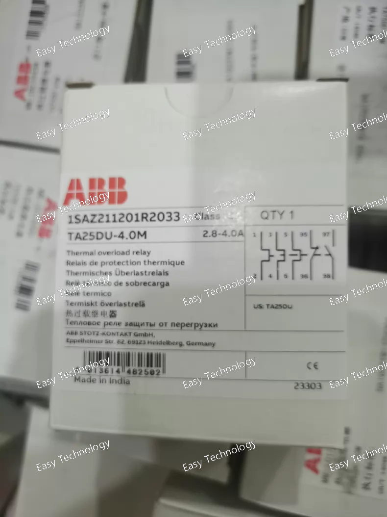 Technical Parameters Basic Electrical Ratings Type: Thermal overload relay Adjustable Current Setting Range: 2.8 … 4.0 A Rated Operational Current (Ie): 4 A Number of Poles / Protected Poles: 3 Trip Class: Class 10A Rated Insulation Voltage (Ui): 690 V Rated Impulse Withstand Voltage (Uimp): ~6 kV Rated Frequency: 50 / 60 Hz Contacts Auxiliary Contacts: 1 NC (normally closed) — trip contact 1 NO (normally open) — signal contact Contact Ratings: AC‑15 / control duties: up to ~3 A (NC) and ~1.5–1.2 A (NO) depending on voltage level Typical auxiliary rating examples: ~3 A @ 120 V AC (NC) ~1.2 A @ 240 V AC (NO) Protection & Functional Features Motor Protection: Overload protection with phase failure sensitivity Temperature Compensation: Included for stable trip performance across ambient ranges Trip‑Free Mechanism: Yes (prevents welded closed in overload) Reset Options: Manual or automatic reset selectable Stop & Test Functions: Integrated Mechanical & Installation Mounting: Direct mount on compatible ABB contactors (TA/TF series) Terminal Type: Screw terminals Connecting Capacity: Flexible conductors: 0.75 … 4 mm² Rigid conductors: 0.75 … 4 mm² Flexible with ferrules: 1 or 2 conductors per terminal Degree of Protection: IP20 on housing; IP10 at main circuit terminals Pollution Degree: 3 Physical & Environmental Approx. Dimensions: ~44 mm (W) × ~80 mm (H) × ~94 mm (D) Approx. Weight: ~0.15 kg Ambient Operating Temperature: –25 °C to +55 °C Storage Temperature Range: –40 °C to +70 °C