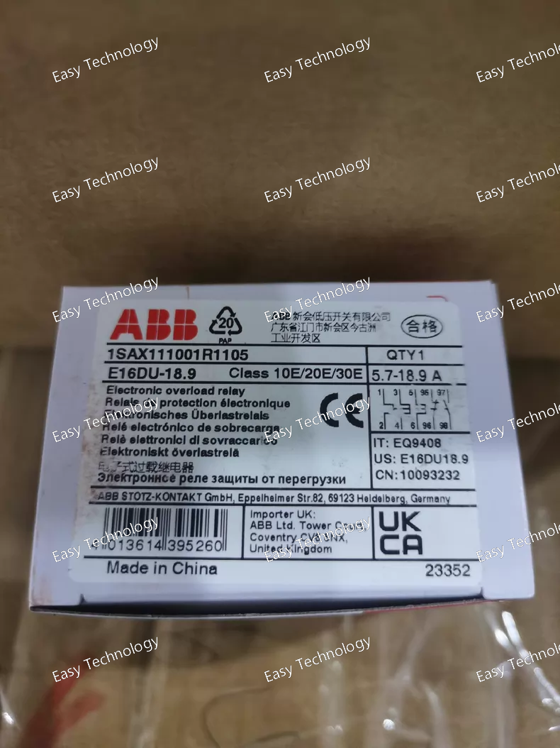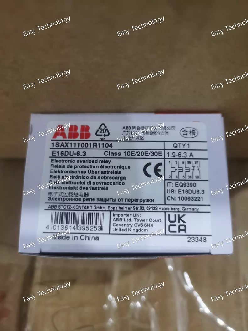Technical Parameters Parameter Specification Series ABB E16 / DS260 / Form 1a Series Product Type 3-Pole, Manual Motor Starter / Motor Protection Circuit Breaker (MPCB) Order Code E16DU6.3 Number of Poles 3-Pole (3P) Rated Operational Current (Ie) Up to 16A (Frame rating). Thermal Overload Setting Range (Ir) Adjustable: 0.10 - 6.3 A (Continuously adjustable via dial). Trip Class Class 10 (Standard for motor protection). Magnetic Short-Circuit Setting (Im) Fixed, typically at 12 x Ir or a specific high value (e.g., ~100A). Short-Circuit Breaking Capacity (Icu) Typically 6 kA or 10 kA at 400V AC. Rated Operational Voltage (Ue) 690V AC Control Method Manual (ON/OFF handle). No coil for remote operation. Auxiliary Contacts None as standard. Optional auxiliary contact blocks (e.g., 1NO+1NC) can usually be added. Phase Loss Sensitivity Yes (Inherent in the 3-pole thermal design). Ambient Temperature Compensation Yes (integrated). Mounting Snap-on mounting on 35mm DIN Rail. Connection Terminals Screw terminals. Standards Compliance IEC/EN 60947-1, IEC/EN 60947-2, IEC/EN 60947-4-1 (as a combination starter). Motor Power Rating At 400V AC, 3-phase: Approx. 3 kW (4 HP) (Based on 6.3A setting). Ambient Temperature -25°C to +60°C (Operation)