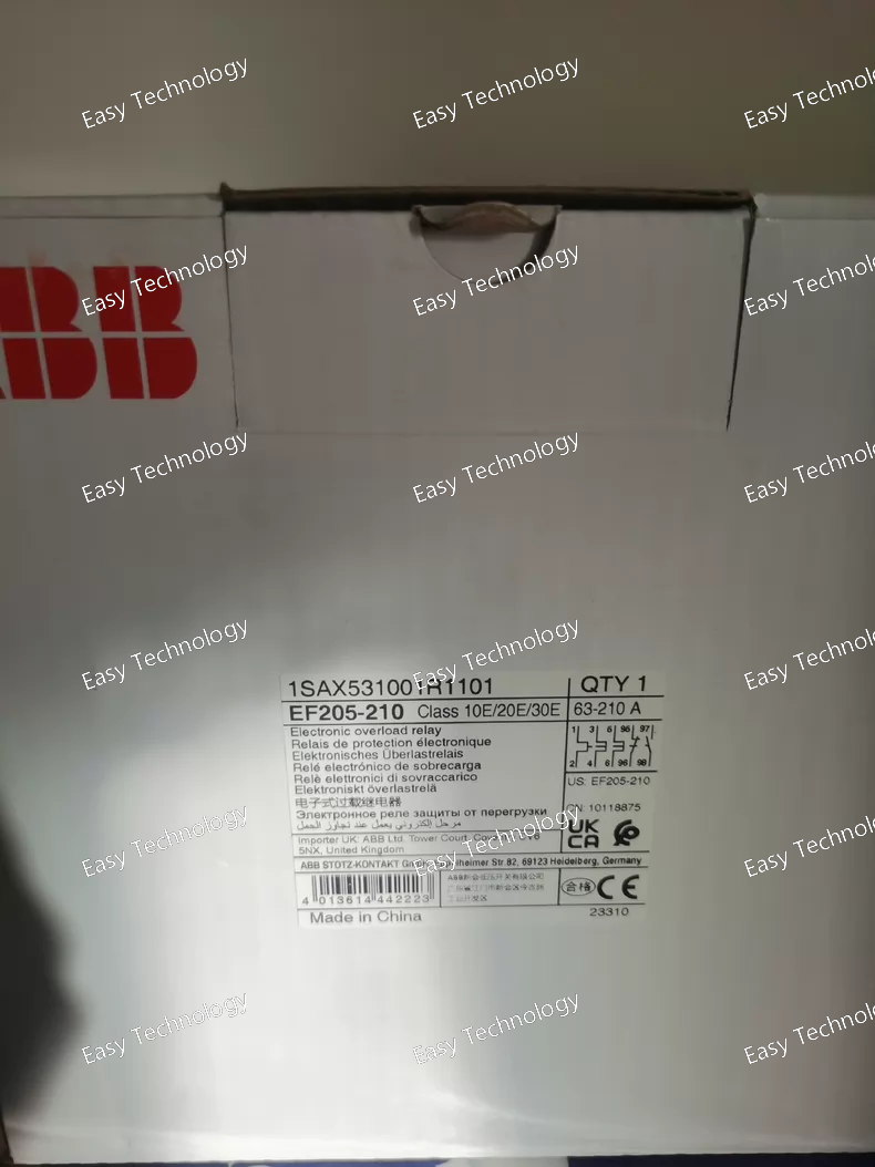 Technical Parameters Parameter Specification Series ABB EF200 Series (Residual Current Monitoring Relays) Product Type Residual Current Relay / Earth Fault Relay Order Code EF205-210 Rated Residual Operating Current (IΔn) 100 mA (as indicated by the "-210" suffix) Residual Current Type Type A (for sinusoidal AC and pulsating DC residual currents) Rated Operational Voltage (Aux Supply - Ue) Typically 230V AC (must verify, some models are line-powered from the monitored circuit or have separate supply terminals). Auxiliary Supply Voltage Range Common range: 230V AC ±10%, 50/60 Hz. (Some versions may support 24-240V AC/DC). Crucial to check datasheet. Output Contact 1 Changeover (SPDT) Relay Contact for signaling or triggering an external shunt trip release. Contact Rating Typically 250V AC, 5A (sufficient to energize a standard shunt trip coil). Operating Time at IΔn < 0.3 seconds (Standard for Type A). Trip Delay Usually instantaneous, but some models may have a small fixed or adjustable delay. Test Function Manual test button to verify functionality by simulating a residual current. Status Indication LED indicator (often red/green) to show "Power ON" and "Tripped" status. Mounting Snap-on mounting on 35mm DIN Rail. Module Width 1 Module (18mm) or 2 Modules, depending on design. Connection Terminals Screw terminals. Terminals for: Auxiliary Power (L, N), Signal Output, and connections to the external Core Balance Current Transformer (CBCT) or internal sensing for direct connection models. Standards Compliance IEC/EN 61008-1, IEC/EN 61009-1 (in conjunction with the associated circuit breaker), IEC/EN 60947-2 Annex M. Ambient Temperature -25°C to +60°C (Operation)