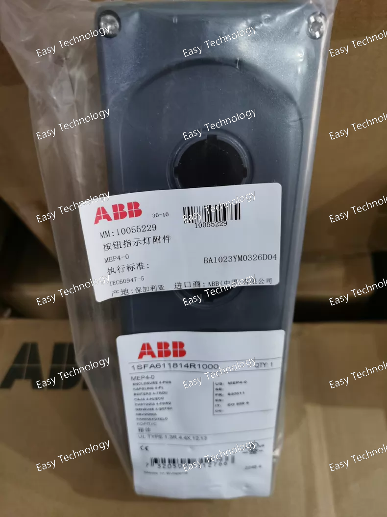 Technical Parameters General Product Type: Pilot device enclosure / control station housing Model: MEP4‑0 Seats / Positions: 4 × 22 mm operator holes Series: Modular pilot device enclosures Mechanical & Construction Housing Material: Heavy-duty polycarbonate plastic Color: Dark gray (cover) / light gray (body) Mounting: Panel mount; face designed for 22 mm operator cut-outs Included Hardware: Stainless steel mounting screws Dimensions & Weight Width: Approx. 221 mm Height: Approx. 61 mm Depth: Approx. 75 mm Weight: Approx. 0.309 kg Operator Cut-out Size: 22 mm diameter per hole Protection & Environmental Ingress Protection: Front IP66 rated for dust/water resistance Operating Temperature Range: –25 °C to +70 °C Storage Temperature: –40 °C to +85 °C Pollution Degree: Suitable for industrial environments Compatibility & Accessories Compatible Operators: Pushbuttons, selector switches, indicator lights, joysticks, and other 22 mm modular ABB pilot devices Contact Blocks: Snap-on or rear mount auxiliary contact blocks and lamp blocks (ordered separately) Cable Entry: Knockout options for wiring feed-through Applications Industrial control stations and operator panels Machine/equipment interface modules Automation system input assemblies Local control stations in manufacturing and power distribution cabinets OEM electrical enclosures and custom control blocks