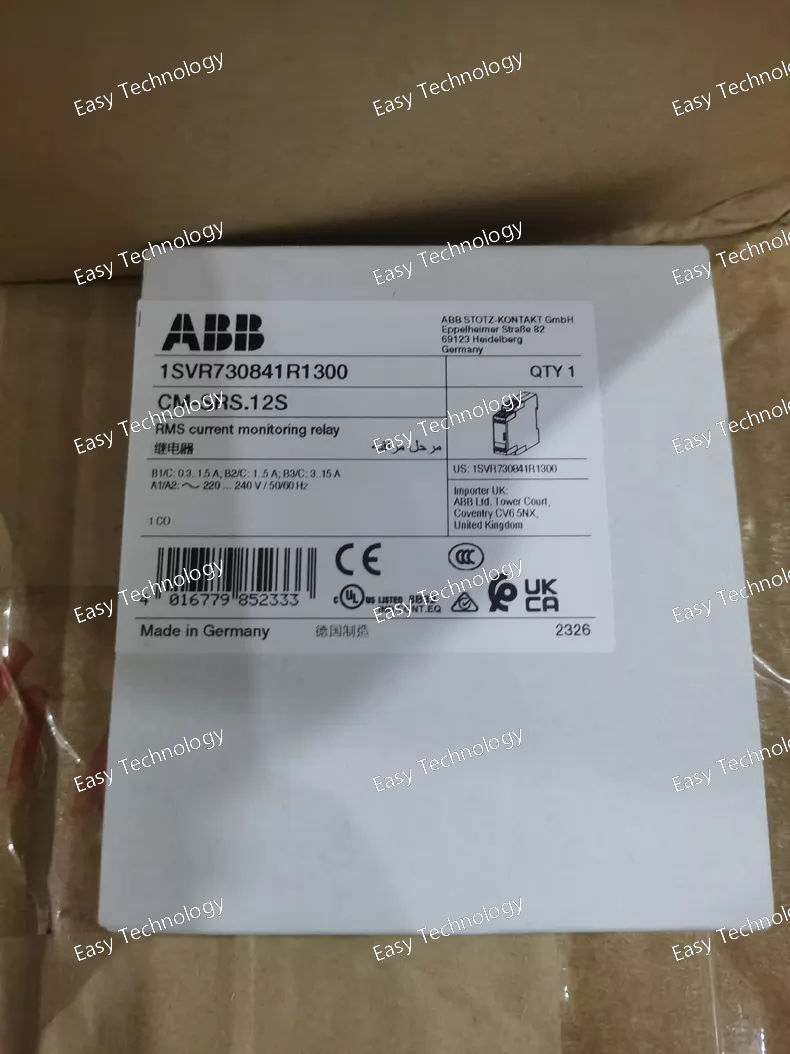 Technical Parameters General Product Type: Auxiliary contact module for molded case circuit breakers (MCCB) Model: AUX‑C 1Q1SY 250 V (T1‑T3) Contact Configuration: 1 Changeover contact (1Q): indicates breaker open/closed position 1 Changeover contact (1SY): indicates trip/fault event Number of Contacts (SPDT): 2 changeover contacts Electrical Ratings Rated Voltage (AC/DC): Up to 250 V AC/DC for signaling circuits Utilization Categories: Suitable for control and signaling use per applicable industrial categories (e.g., AC‑15/DC‑13) Typical rated currents at 250 V AC/DC consistent with auxiliary contact usage Standards Compliance: Designed to meet IEC 60947‑2 and related safety standards Contact Type: Silver alloy or equivalent industrial contact material for reliable switching Compatibility Suitable Breaker Families: ABB Tmax XT series breakers Dedicated slots for T1/T2/T3 accessory positions Mounting Position: Installed externally on the right‑hand side accessory slot of the breaker Pre‑cabled Version: Supplied with approx. 1 m of cable for easy connection Mechanical & Installation Connection: Pre‑wired cable termination for remote connection to control or indicator circuits Mounting: Plug‑in or snap‑on accessory for compatible breaker accessory slot Dimensions & Weight: Compact module that fits within breaker accessory space Operating Orientation: Mounts in the specified accessory slot(s) without modification Environmental Operating Temperature Range: Suitable for typical industrial panel ambient conditions Pollution Degree: Industrial pollutions (IEC categorization) Protection: Front should be protected when installed behind the panel face Functions & Uses Breaker position indication: Shows whether the breaker is closed (ON) or open (OFF) Trip indication: Signals when the breaker has tripped due to overload or fault Remote control feedback: Ideal for PLC, annunciators, control circuits, or automation monitoring AC/DC control systems: Works with both AC and DC control voltages up to 250 V Key Features Dual changeover contacts for combined position and trip status Pre‑wired cable for easy integration Broad voltage compatibility with AC/DC up to 250 V Direct mounting to ABB Tmax XT breaker accessory slot Enhanced monitoring for breaker control and safety logic