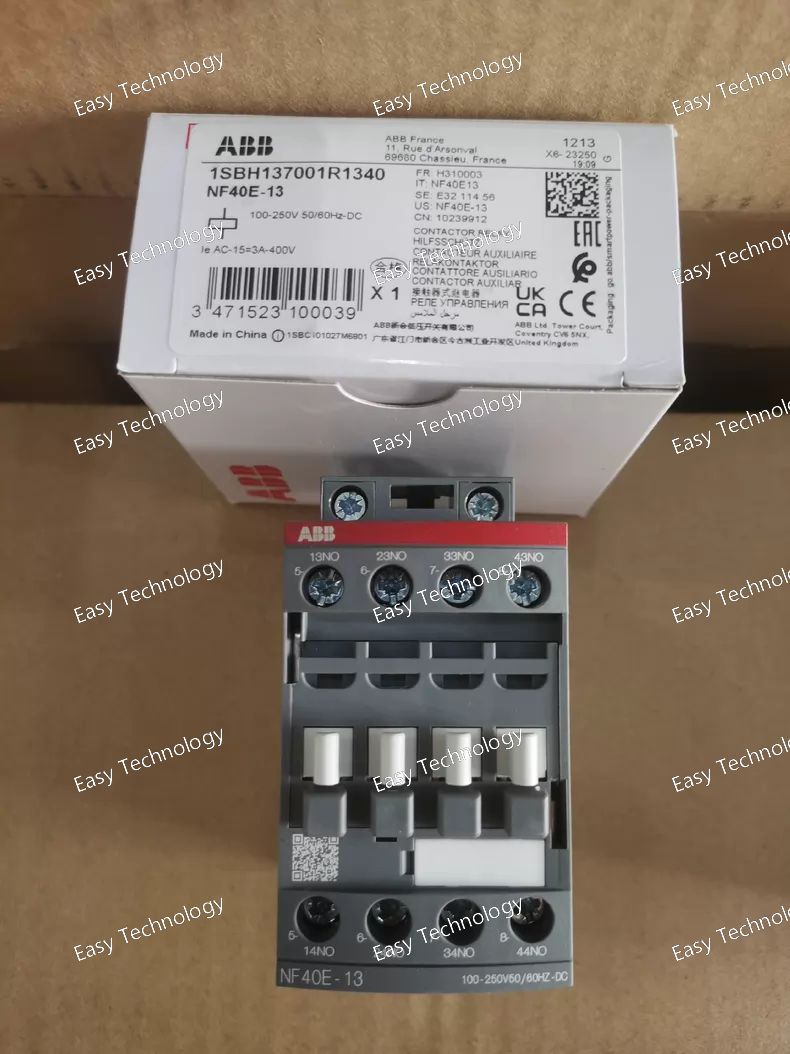 Technical Parameters General Product Type: Contactor relay / auxiliary contactor Model: NF40E‑13 Series: NF relay series Number of Poles / Contacts: 4 × Normally Open (NO) Mounting: DIN‑rail or screw mounting in control panels Terminal Type: Screw terminals Housing Design: Block‑type compact relay Weight: ~0.27 kg Operating Ambient Temperature: Approximately −40 °C to +70 °C Control / Coil Rated Control Supply Voltage (Uc): 100 – 250 V AC/DC (single wide range coil) Rated Frequency: 50 / 60 Hz for AC coil operation Control Circuit Compatibility: AC or DC operation without separate coil changes Electrical Ratings Rated Insulation Voltage (Ui): ~690 V Rated Operational Voltage: Auxiliary circuit circuits up to 690 V Conventional Free‑air Thermal Current (Ith): 16 A (free‑air at 40 °C) Rated Operational Current (AC‑15): ~6 A @ 24 / 127 V AC ~4 A @ 220 / 240 V AC ~3 A @ 400 / 440 V AC ~2 A @ 500 / 690 V AC Rated Operational Current (DC‑13): ~6 A @ 24 V DC ~2.8 A @ 48 V DC ~1 A @ 72 V DC ~0.55 A @ 125 V DC ~0.27 A @ 250 V DC ~0.15 A @ 400 V DC ~0.13 A @ 500 V DC ~0.10 A @ 600 V DC Performance & Switching Rated Impulse Withstand Voltage (Uimp): ~6 kV Rated Short‑time Withstand Current (Icw): ~140 A for 0.1 s ~100 A for 1 s Maximum Electrical Switching Frequency: ~1200 cycles/hour (AC‑15) ~900 cycles/hour (DC‑13) Maximum Mechanical Switching Frequency: ~6000 cycles/hour Mechanical & Connection Connecting Capacity: Flexible conductor with ferrule: ~0.75 … 2.5 mm² Rigid conductor: ~1 … 2.5 mm² Wire Stripping Length: ~10 mm Tightening Torque: Standard industrial terminal torque (approx. 1.2 N·m) Environmental & Protection Protection Rating: Terminals: IP20 Panel installation provides typical front panel protection Pollution Degree: Suitable for industrial environments Maximum Operating Altitude: Up to ~3000 m without derating Applications Switching of auxiliary and control circuits in automation panels Interface between control logic (PLC, control switches) and load circuits Signal switching in industrial machinery and power systems Pilot duty and control relay roles in electrical panels