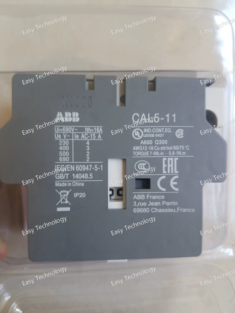 Technical Parameters General Product Type: Auxiliary contact block Model: CAL5‑11 Mounting: Side mount accessory Contact Configuration: 1 Normally Open (NO) + 1 Normally Closed (NC) Terminal Type: Screw terminals Compatible With: A‑line series contactors and equivalent modular control relays Electrical Ratings Rated Operational Voltage (AC): up to 690 V AC Rated Operational Voltage (DC): up to 250 V DC Rated Operational Current (AC‑15): up to ~6 A at 24–127 V AC ~4 A at 220–240 V AC ~3 A at 380–440 V AC ~2 A at 500–690 V AC Rated Operational Current (DC‑13): ~6 A at 24 V DC ~2.8 A at 48 V DC ~1 A at 72 V DC ~0.55 A at 110–125 V DC ~0.3 A at 220–250 V DC Rated Insulation Voltage: ~690 V Short‑Time Withstand Current: ~140 A for 0.1 s Performance & Durability Mechanical Switching Frequency: up to ~3600 cycles/hour Electrical Switching Frequency: up to ~1200 cycles/hour Mechanical Durability: High cycle life suitable for frequent auxiliary switching Mechanical & Physical Dimensions (Approx.): Width: ~12 mm Height: ~74 mm Depth/Length: ~62 mm Weight: Lightweight compact block Degree of Protection: IP20 at auxiliary terminals Environmental Operating Temperature: Typical industrial ambient range Storage Temperature: Extended ambient range Pollution Degree: Suitable for industrial control environments Applications Auxiliary feedback and control contacts for contactors Status indication and interlock circuits Control logic extension in motor control panels and automation systems Industrial machinery and equipment control circuits