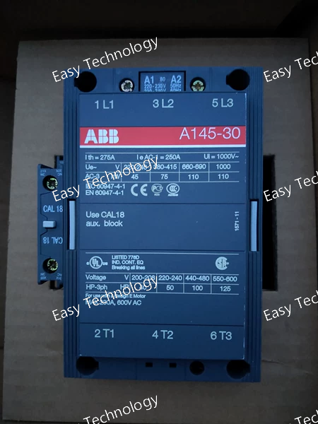 Key Specifications General Product Type: 3‑pole power contactor Model: ABB A145‑30‑11 Poles: 3 normally open main contacts Auxiliary Contacts: 1 NO + 1 NC Control / Coil Control (Coil) Voltage: 220–230 V AC @ 50 Hz / 230–240 V AC @ 60 Hz Coil Type: AC coil designed for standard AC control circuits Current & Operational Ratings Rated Operational Current (AC‑3): ~145 A (motor load) Rated Operational Current (AC‑1): up to 250 A (general use) Conventional Free‑Air Thermal Current (Ith): ~250 A Rated Operational Voltage (Main): up to 690 V AC Rated Insulation Voltage (Ui): ~1000 V AC Power & Load Capabilities Rated Power (AC‑3): • ~45 kW @ 220–240 V • ~75 kW @ 380–415 V • ~110 kW @ 660–690 V Motor Horsepower (approx): up to ~50 HP @ 230 V / ~100 HP @ 460 V General Purpose Rating: high current capacity for power switching Electrical & Mechanical Performance Rated Making/Breaking Capacity: ~10× Ie (AC‑3) Short‑Time Withstand Current (Icw): ~1200 A @ 40 °C (10 s) Rated Frequency: 50/60 Hz Terminal Connections: Rail or screw connection options Mechanical Durability: Designed for frequent switching cycles Environmental & Physical Mounting: Panel / control enclosure mount Operating Temperature Range: Typical industrial ambient range Weight: ~3.5 kg Construction: Rugged industrial grade