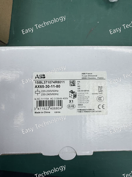 Key Specifications General Product Type: 3‑pole power contactor Series: ABB AX115 Model: AX115‑30‑11‑80 Poles: 3 (three main poles) Main Contacts: 3 normally open (NO) Auxiliary Contacts: 1 NO + 1 NC Control / Coil Rated Control (Coil) Voltage: 220–230 V AC at 50 Hz / 230–240 V AC at 60 Hz Control Type: AC coil Current & Operational Ratings Rated Operational Current AC‑3 (Ie): ~115 A at typical low‑voltage motor loads Rated Operational Current AC‑1 (Ie): ~160 A (general switching) Rated Insulation Voltage (Ui): 690 V Rated Operational Voltage (Main Circuit): up to 1000 V AC Power & Load Rated Operational Power AC‑3: – ~55 kW at ~400 V AC – Higher capability up to ~75 kW at higher voltages Short‑Time Withstand Current (Icw): hundreds to ~1,300 A depending on time duration Electrical & Mechanical Performance Conventional Free‑Air Thermal Current (Ith): ~160 A Rated Making/Breaking Capacities: scaled with AC‑3 utilization Maximum Electrical Switching Frequency: ~300 cycles/hour Maximum Mechanical Switching Frequency: ~3600 cycles/hour Mechanical Durability: millions of operations Physical Approximate Dimensions: – Width: ~102 mm – Depth (Length): ~123.5 mm – Height: ~148 mm Weight: ~1.9 kg Terminal Type: Bar / screw connections Environmental & Protection Ambient Operating Temperature: broad industrial range Degree of Protection: IP20 at auxiliary terminals and basic housing