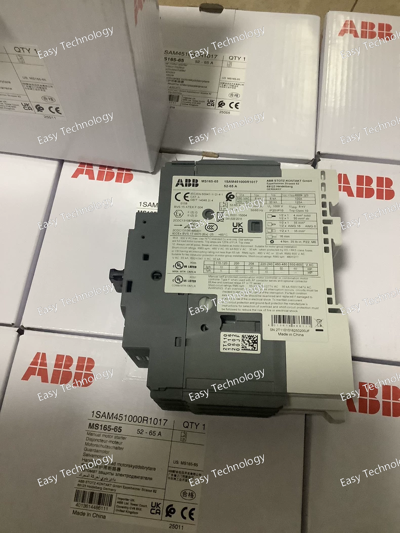 Technical Specifications Parameter Specification Part Number / Model ABB 1SAM451000R1017 Product Type Manual Motor Starter / Motor Protection Circuit Breaker Series / Family MS165 Rated Current Setting Range 52 – 65 A Rated Operational Current (Ie) 65 A Number of Poles 3 (3P) Rated Operational Voltage (Ue) 250 – 690 V AC Interrupting Capacity (Icu) up to 50 kA @ 230/400 V AC, decreasing at higher voltages (approx.) Service Breaking Capacity (Ics) ~30 kA @ 230/400 V AC Instantaneous Short‑Circuit Setting 975 A fixed Rated Operational Power (AC‑3) ~30 kW @ 400 V AC Mounting DIN‑rail (TH35) or panel Control / Handle Rotary ON/OFF with clear position indicator Trip Mechanism Thermo‑magnetic with phase‑failure sensitivity Disconnect Function Built‑in Temperature Compensation Yes Trip‑Free Mechanism Yes Accessory Options Auxiliary contacts, signalling contacts, undervoltage release, shunt trip, power feed blocks Terminal Type Screw terminals Degree of Protection IP20 Ambient Operating Temperature −25 °C to +60 °C Weight ~0.98 kg Dimensions (Approx.) Width: ~55 mm; Height: ~142.65 mm; Depth: ~122.1 mm