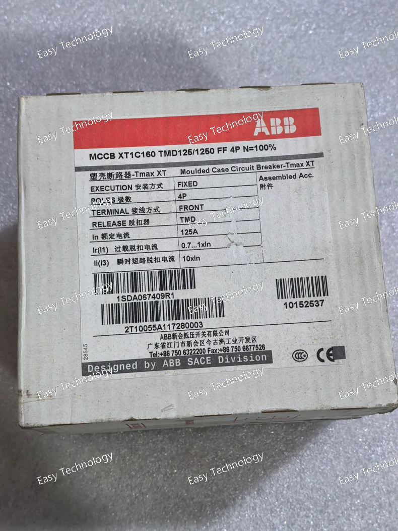 Technical Parameters Parameter Specification Product type Molded Case Circuit Breaker (MCCB) Product series ABB SACE Tmax XT1C Poles 4 poles Terminal type Front fixed terminals (FF) Trip unit type TMD (Thermal-magnetic) Adjustable instantaneous (short-circuit) setting 125–1250 A Rated uninterrupted current (Iu) 160 A frame rating Rated operational voltage (Ue) Up to 690 V AC / 500 V DC Rated insulation voltage (Ui) 800 V AC Rated impulse withstand voltage (Uimp) 8 kV Rated service short-circuit breaking capacity (Ics) 50 kA @ 220–230 V AC; 36 kA @ 380–415 V AC; 25 kA @ 500 V AC; 8 kA @ 690 V AC (typical IEC values) Rated ultimate breaking capacity (Icu) Same as Ics depending on voltage Protection functions Overload and short‑circuit protection Standards compliance IEC 60947‑2 Mechanical durability ~25,000 operations Electrical durability ~8,000 operations at rated load Mounting Fixed panel installation Typical applications Industrial and commercial power distribution, feeder protection, motor control centers
