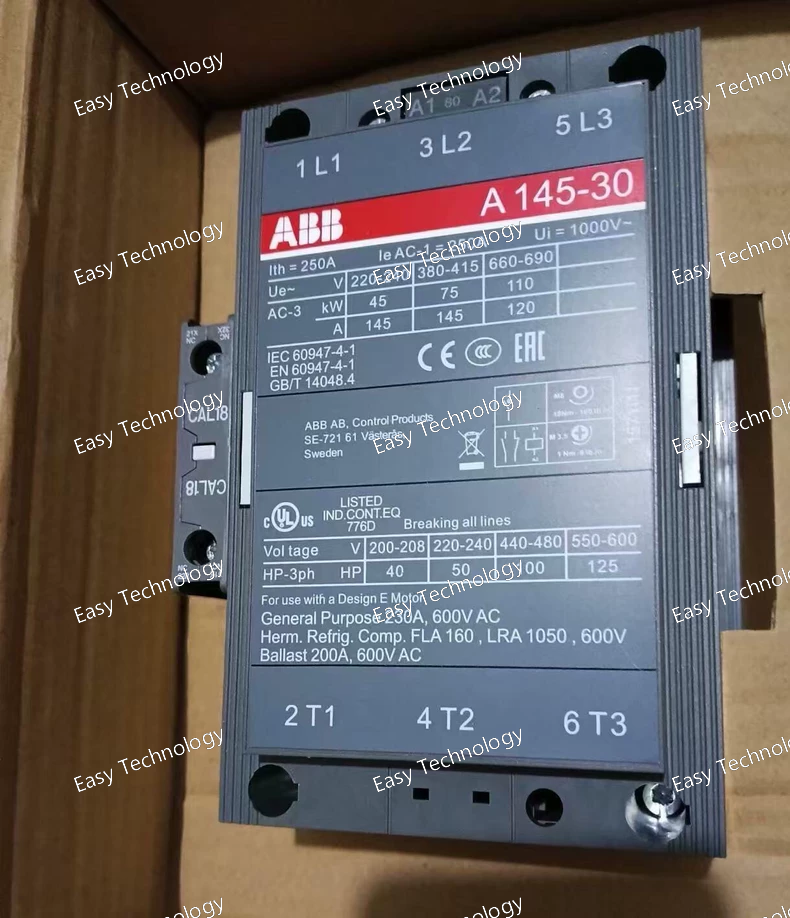 Technical Parameters Parameter / Feature Specification / Detail Model A145‑30‑11 (ABB A‑line) Number of Poles (Main Contacts) 3 (3‑pole) Main Contact Configuration 3 × NO (normally‑open) main contacts Auxiliary Contacts 1 NO + 1 NC (auxiliary / control contacts) Conventional Free‑air Thermal Current (Ith) 250 A (at 40 °C free‑air) Rated Operational Current (AC‑1, Ie) 250 A (at 690 V AC, 40 °C) Rated Operational Current (AC‑3, Ie) ~ 145 A (at 400–415 V AC, 55 °C) Rated Operational Voltage (Main Circuit) Up to 690 V AC (some variants spec up to 1000 V) Rated Operational Power (AC‑3) / Motor Load Capacity - 45 kW at 220–240 V AC - 75 kW at 380–415 V AC - 110 kW at 500–690 V AC (approximate, depending on supply and load) Coil Voltage (Control) AC‑operated, various coil‑voltage variants available (e.g. 220–230 V AC for many versions) Standards IEC 60947‑4‑1 / EN 60947‑4‑1 compliant (standard for motor‑control contactors) Auxiliary / Control Options Compatible with auxiliary contact blocks / accessories (side‑ or top‑mount) for extended functionality Typical Applications Three‑phase motor control (start/stop), contactor switching, load distribution, motor bypass/isolation, HVAC, pumps, compressors, general industrial loads