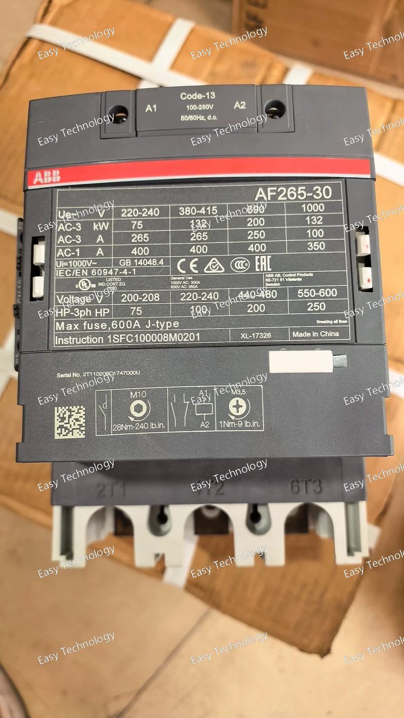 Technical Parameters Parameter / Feature Specification / Detail Model / Type AF265‑30‑11‑13 (ABB AF series contactor) Poles / Contacts 3 main contacts (3‑pole, 3 NO) + 1 auxiliary contact block (1 NO + 1 NC) Control Coil Voltage 100–250 V AC or 100–250 V DC (50/60 Hz) — wide‑range coil Main Circuit Rated Insulation Voltage (Ui) 1000 V (IEC) / 600 V (UL/CSA) Rated Operational Voltage (Main Circuit) Up to 1000 V AC Rated Operational Current (AC‑1) Up to 350 A at 1000 V (40 °C) Rated Operational Current (AC‑3) / Motor Switching 265 A at 400‑415 V AC; 250 A at 500‑690 V AC Rated Motor Power (AC‑3) Up to ~132 kW at 400 V AC; higher depending on voltage (e.g. ~200 kW at 690 V) Making / Breaking Capacity Making capacity: 10 × Ie (AC‑3); Breaking capacity: 8 × Ie (AC‑3) Rated Impulse Withstand Voltage (Uimp) 8 kV Coil Features Electronic coil interface with reduced power consumption; built‑in surge suppression; tolerant of voltage dips/sags Auxiliary/Accessories Built‑in 1NO + 1NC auxiliary contact; optional add‑on auxiliary contact blocks; compatible with accessories per AF series Operating Conditions Ambient temperature range approx –25 °C to +50 °C (standard), wider range if no overload relay fitted Mechanical Endurance ~ 5 million mechanical operations Terminal / Connection Main circuit: bar‑type terminals (suitable for heavy cables/busbars); Auxiliary circuits: screw‑terminals Dimensions / Sizeframe Frame size “265”; typical industrial mounting dimensions (large form‑factor) Typical Applications 3‑phase motor starting / stopping, large power‑circuit switching, industrial load control, heavy duty machinery, HVAC / pumps / compressors / general industrial motors and loads