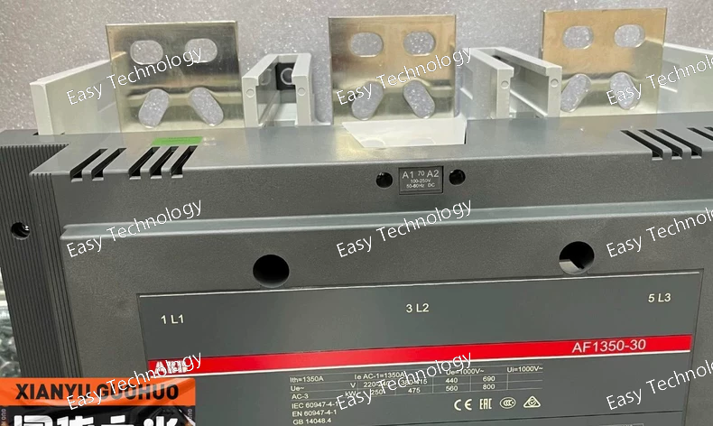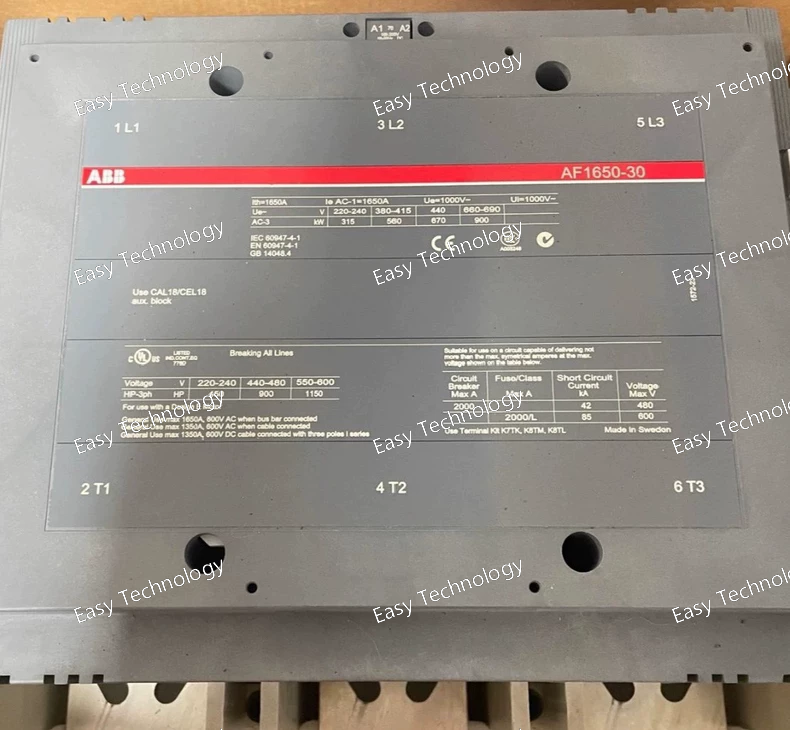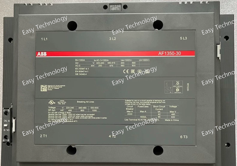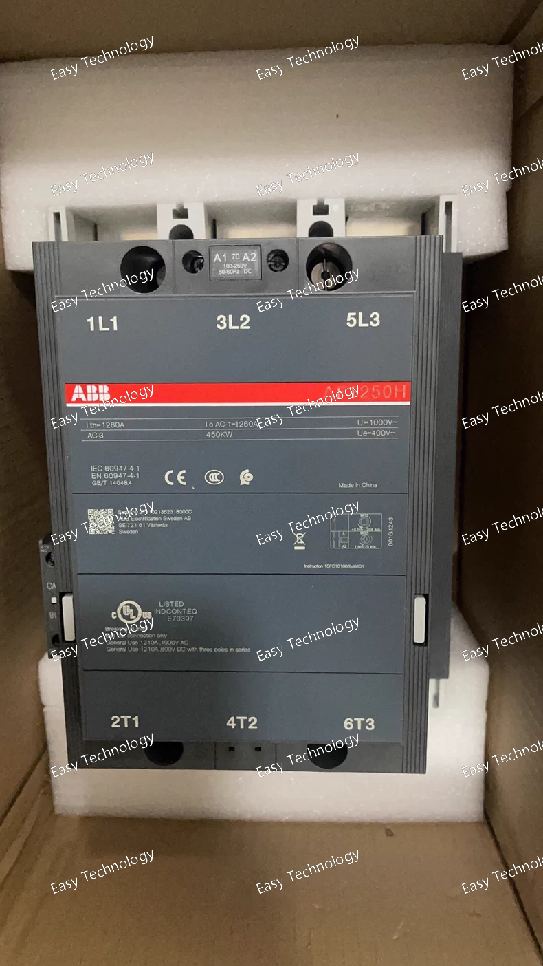 Technical Specifications General / Mechanical Contactor type: 3-pole power contactor, block (non-reversing IEC) Main contacts: 3 × normally-open (NO) contacts Auxiliary contacts: 1 NO + 1 NC auxiliary contact Rated main circuit voltage: up to 1000 V AC Frame / Series: AF1650 Termination: Screw or bar (bus-bar capable) main-circuit connection Dimensions (approx): Width 438 mm, Depth 244 mm, Height 392 mm Weight (net): ~ 33 kg Coil / Control Circuit Control (coil) voltage (Uc): 100–250 V AC (50/60 Hz) or 100–250 V DC Coil type: Electronic wide-range AF coil — tolerant of control-voltage variation, with built-in surge suppression Coil allows same unit to be used under different supply/control voltages without coil replacement Main Circuit Ratings & Performance Thermal / Continuous Load (AC-1 / General Loads): Conventional free-air thermal current (I_th): 1650 A (at 40 °C ambient) Rated operational current (I_e, AC-1): 1650 A @ 1000 V or 690 V at 40 °C 1450 A @ 1000 V or 690 V at 55 °C 1270 A @ 1000 V or 690 V at 70 °C Motor / Inductive Load (AC-3): Rated operational current (I_e, AC-3): ~1050 A at 220/230/240 V, 380/400 V, 415 V, 440 V (55 °C) ~950 A at 500 V (55 °C) ~950 A at 690 V (55 °C) Rated motor power (P_e, AC-3): ~315 kW at 220/230/240 V ~560 kW at 380/400 V ~630 kW at 415 V ~710 kW at 440–500 V ~1000 kW at 690 V ~600 kW at 1000 V Making capacity (AC-3): up to 10 × I_e (i.e. 10 × rated motor current) Short-Time & Short-Circuit Ratings Short-time withstand current (I_cw), cold state, 40 °C ambient free air: 10 s → 10,000 A 1 s → 12,000 A 30 s → 7,500 A 1 min → 5,500 A 15 min → 2,200 A Maximum breaking / making capacity: up to 12,000 A (depending on load power factor) Electrical / Environmental & Usage Conditions Suitable for switching AC resistive, inductive loads, motor circuits, general power circuits up to 1000 V Ambient temperature range (with thermal overload relay): –25 °C to +50 °C Ambient temperature range (without thermal overload relay): –40 °C to +70 °C Storage temperature: –40 °C to +70 °C Maximum permissible installation altitude: 3000 m Coil terminal protection: IP20; Main terminals (when open): IP00 Design & Features Wide-range AF electronic coil — no need to change coil for different control voltages (AC or DC) Built-in surge suppression — provides reliability under voltage dips or unstable supply Modular block-type design — easy integration in switchgear, with possibility to add auxiliary contact blocks and other accessories Robust main contacts and bus-bar capable connections — suitable for heavy-duty circuits, high-current and high-power switching