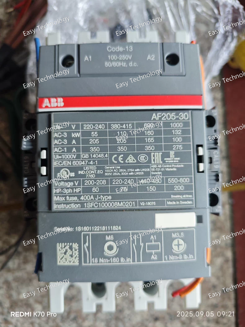 Technical Specifications Parameter / Item Value / Description Poles / Contacts 3 main poles — 3 × NO (normally open) Auxiliary Contacts 1 NO + 1 NC (standard “‑11” auxiliary contact set) Frame / Series AF750 (AF series large-frame contactor) Main Circuit Rated Operational Voltage (Ue) Up to 1000 V AC (IEC standard) / up to 600 V AC (UL/CSA rating) Control (Coil) Voltage Range (Uc) Wide‑range coil: e.g. 100–250 V AC/DC; other coil variants available (e.g. 24–60 V DC or 48–130 V AC/DC depending on order code) Utilization / Ratings (AC‑1, general / resistive load) ~ 1050 A (for many coil variants) — general-purpose load rating Utilization / Ratings (AC‑3, motor duty / inductive load) Ie (AC‑3) ~ 750 A @ typical 400 V (three‑phase) motor supply Rated Power (Motor Load, AC‑3) ~ 400 kW (at 400 V, three-phase) — typical motor power rating for this contactor Insulation & Withstand Ratings Rated insulation voltage (Ui): 1000 V (IEC) / 600 V (UL/CSA) Impulse withstand voltage (Uimp): 8 kV Making / Breaking Capacity Making capacity (AC‑3): up to 10 × Ie Breaking capacity (AC‑3): up to 8 × Ie Short‑Circuit / Short‑time Withstand Capability E.g. withstands short-time currents — under specified conditions allowed up to several kA for short durations (exact value depends on wiring/system) Terminal / Connection Type Main circuit: lug/bar‑type terminals (bus‑bar capable) Auxiliary / coil terminals: screw / lug terminals Mechanical & Environmental Operating ambient temperature range: –40 °C to +70 °C (without overload relay) Storage temperature: –40 °C to +70 °C Max installation altitude without derating: 3000 m Protection rating: Coil terminals IP20; main terminals (when open) IP00 Design / Features - Electronically controlled wide‑range coil, tolerant to supply/control‑voltage variation - Built-in surge suppression, stable operation under voltage dips/sags - Modular block‑type design, supports auxiliary contact blocks and accessories - Suitable for motor starting, heavy load switching, distribution, bypass, and general industrial power circuits