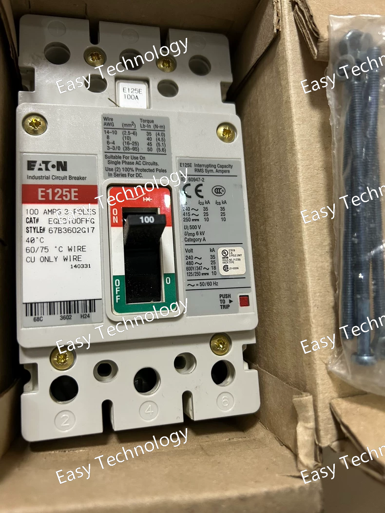 Technical Parameters Parameter Category Description / Value Brand & Series Eaton, E-Frame Series Model Number E125E Rated Current 125 A (Frame Size) Pole Configurations Available in 1, 2, and 3-pole versions (specific model varies) Rated Voltage 120/240V AC for 1-2 poles 240V AC for 3 poles Interrupting Rating 10 kA / 14 kA / 22 kA (Depending on specific version and certification) Trip Characteristics Thermal-Magnetic • Thermal Trip: Inverse time delay for overloads • Magnetic Trip: Instantaneous for short-circuits Standards Compliance UL 489, CSA C22.2 No. 5