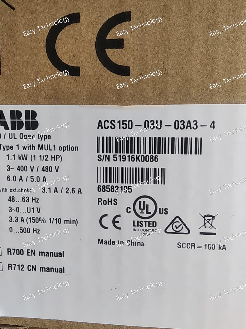 Key Specifications Parameter Category Specification Drive Series/Model ACS150-03U-04A1-4 Rated Output Current 4.1 A Rated Output Power 1.5 kW (2 HP) Input Supply Voltage 380 - 480 V AC (± 10%), 3-phase Input Supply Phases 3-phase Output Voltage 0 - Input voltage Output Phases 3-phase Enclosure Rating IP00 (Open Chassis). Must be installed inside a protective control cabinet (e.g., IP20, IP54). Control Panel Integrated, Sealed Keypad (IP66 protection for the keypad). Potted and non-removable in standard form. Cooling Method Self-cooled (convection) Control Method Scalar Control (V/f) Key Standard Features • Ultra-Compact & Sealed Design: All-in-one unit with a durable keypad. • Easy Mounting: Snap-on design for DIN rail or screw mounting. • Application Macros: Pre-set configurations (e.g., Hand/Auto, 2-Wire, 3-Wire). • Analog Input: 1 channel (configurable for 0/4...20 mA or 0...10 V). • Digital Inputs: 3 channels. • Relay Output: 1 changeover contact. • Modbus RTU (RS-485) communication via an optional external module. Protection Features • Motor thermal overload protection (I²t model) • Short circuit, ground fault, overcurrent, and overvoltage protection • IGBT overtemperature protection • Motor stall prevention Typical Applications Small pumps, fans, miniature conveyors, packaging machinery, and other basic material handling equipment.