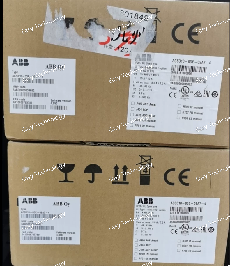Specifications Parameter Specification Series ACS310 (Material Handling & General Purpose) Typical Power 4.0 kW (5 HP) Common Voltage 400-480V AC, 3-phase (also available in 200-240V versions) Current Rating ~9.8 A (at 400V) Enclosure Options IP21 / IP55 (depends on model suffix) Control Method Direct Torque Control (DTC) or V/Hz Core Features Application-Optimized Material Handling Macros: Pre-programmed for conveyors, cranes, hoists High Starting Torque: Up to 180% for demanding starts S-curve Acceleration: Smooth ramp-up/down for material transport Torque Proving: Ensures adequate torque before load release Technical Capabilities Built-in Modbus RTU (RS-485 standard) Enhanced I/O Configuration: 3 digital inputs (24V DC) 2 analog inputs (0-10V/0-20mA) 2 relay outputs 1 analog output (0-20mA) Integrated Brake Chopper for dynamic braking Flying Start: Can start into rotating motors PID Controller: Built-in for process control Protection & Safety Motor Protection: Thermal (I²t), phase loss, ground fault, stall prevention Drive Protection: Overcurrent, overvoltage, short circuit, overtemperature Safe Torque Off (STO): Optional safety function EMC Compliance: Built-in RFI filter (Category C3 standard) Typical Applications Conveyor Systems: Belt conveyors, roller conveyors, assembly lines Material Handling: Cranes, hoists, elevators, lifting equipment Packaging Machinery: Wrappers, fillers, labelers Machine Tools: Lathes, mills, drills Industrial Automation: Production lines, positioning systems