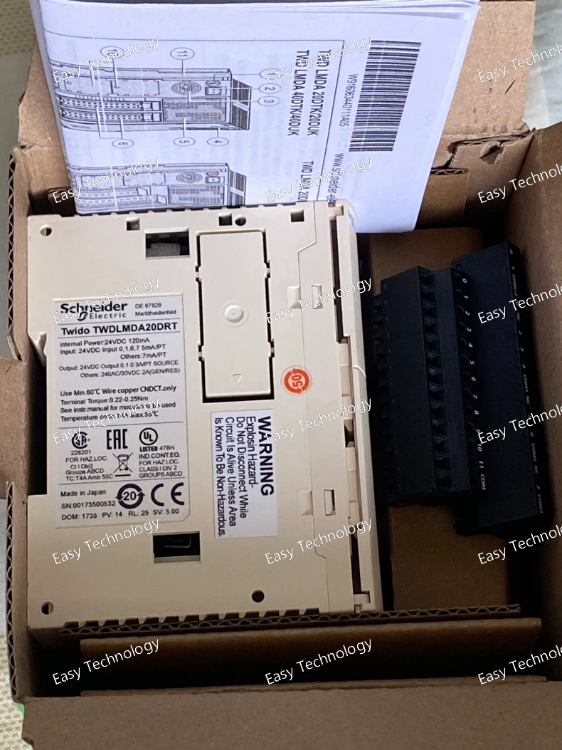 The Schneider Electric TWDLMDA20DRT is a compact, all-in-one programmable logic controller (PLC) from the Modicon M221 Logic Controller series. Designed for small to medium-sized automation applications, it integrates a CPU, digital I/O, analog I/O, communication ports, and a built-in real-time clock (RTC) in a single, space-saving unit.