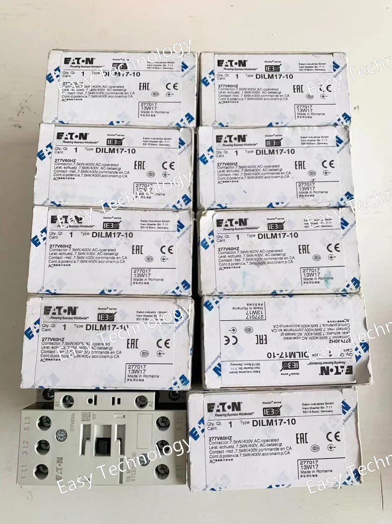 Technical Parameters Parameter Category Description / Value Brand & Series Eaton, DILM Series Model Number DILM17-10 Rated Operational Current (Ie) 17 A at AC-3, 400V Thermal Current (Ith) 17 A Poles (Main Circuit) 3 (Normally Open) Auxiliary Contacts 1 NO (Normally Open) + 1 NC (Normally Closed) - Convertible Rated Operational Voltage (Ue) Up to 690V AC Control Coil Voltage Available in multiple standard AC voltages (e.g., 24V, 110V, 230V, 400V AC). The specific voltage must be specified when ordering. Utilization Categories AC-3: Squirrel cage motors: Starting, switching off during running AC-1: Non-inductive or slightly inductive loads Motor Rating (at 400V AC) 7.5 kW / 10 HP Mechanical Life ~ 15 million operations Electrical Life (AC-3) ~ 1.5 million operations Mounting Standard 35mm DIN Rail (EN 60715) or screw mounting Standards Compliance IEC/EN 60947-4-1, UL 508, CSA C22.2 No. 14 Terminal Type Cage Clamp / Screw Clamp