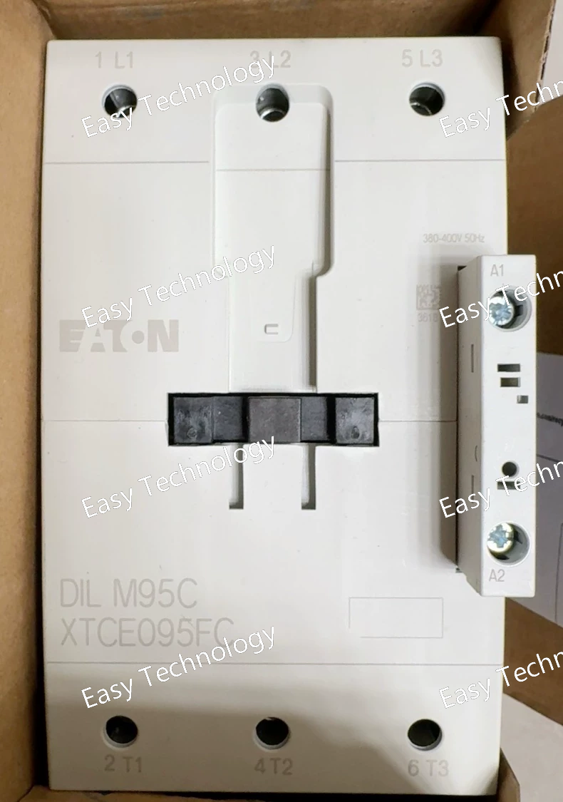 Technical Parameters Parameter Category Description / Value Brand & Series Eaton, DILM Series Model Number DILM95C XTCE095FC Rated Operational Current (Ie) 95 A at AC-3, 400V Thermal Current (Ith) 95 A Poles (Main Circuit) 3 (Normally Open) Auxiliary Contacts Typically 1 NO (Normally Open) - Fixed (configurable with additional blocks) Rated Operational Voltage (Ue) Up to 690V AC Control Coil Voltage DC operating coil (Specific voltage defined by the XTCE095FC suffix, e.g., 24V DC). Utilization Categories AC-3: Squirrel cage motors: Starting, switching off during running AC-1: Non-inductive or slightly inductive loads Motor Rating (at 400V AC) 45 kW / 60 HP Mechanical Life ~ 10 million operations Electrical Life (AC-3) ~ 1 million operations Mounting Standard 35mm DIN Rail (EN 60715) or screw mounting Standards Compliance IEC/EN 60947-4-1, UL 508, CSA C22.2 No. 14 Terminal Type Screw Clamp