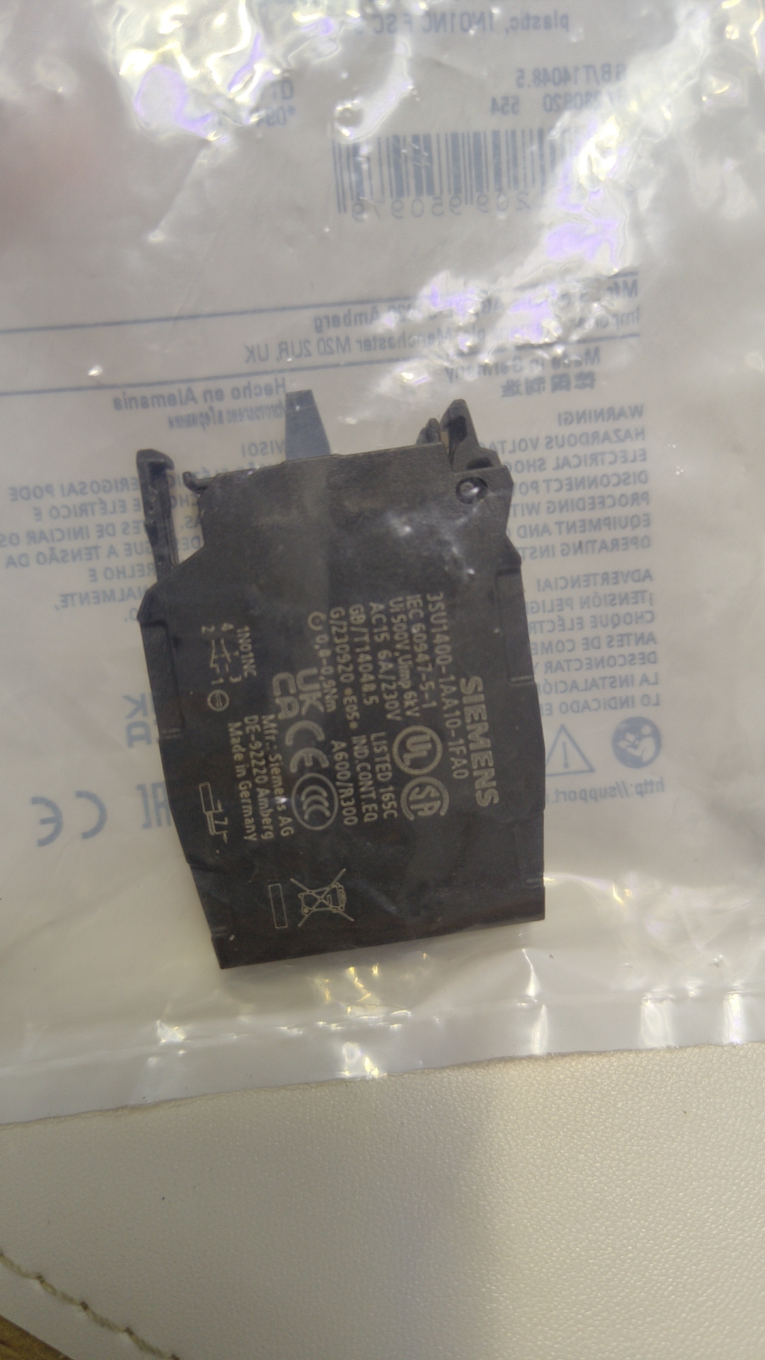 The 3SU1400-1AA10-1FA0 is an illuminated pushbutton from Siemens' 3SU1 series, featuring a 30 mm mushroom head actuator with a spring-return mechanism. It integrates 1 NO (normally open) and 1 NC (normally closed) contact, rated for 10 A/250 V AC or 5 A/30 V DC, and includes a green LED indicator powered by 24 V DC.
