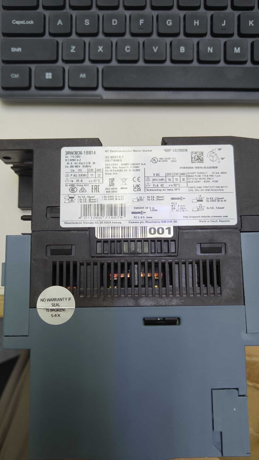 The 3RW3036-1BB14 is a 3-phase AC soft starter from Siemens' 3RW30 series, designed for 37 kW motors at 400 V AC (50 Hz), with a rated current of 72 A. It supports main supply voltages of 380–480 V AC and a 24 V DC control voltage, offering starting methods like voltage ramp, current limit, soft stop, and skip cycle.