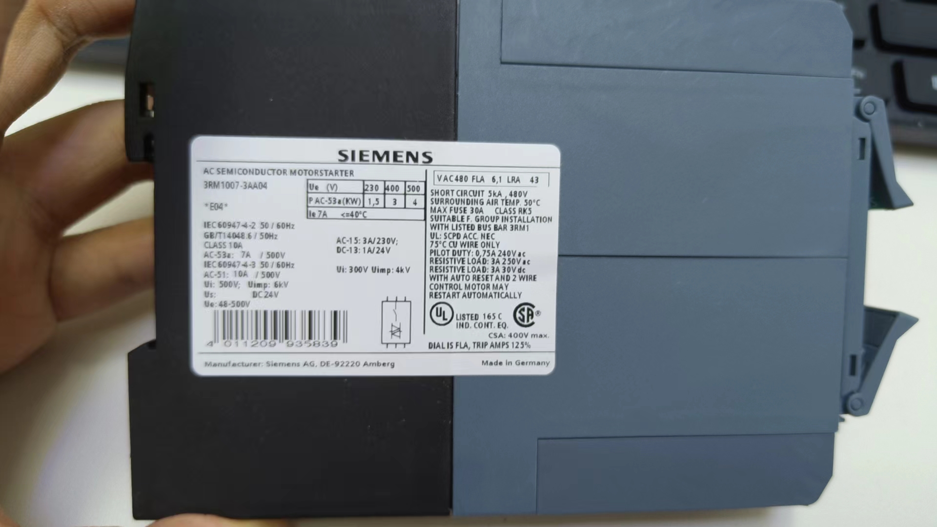 The 3RM1007-3AA04 is a compact 3-phase motor starter from Siemens' 3RM10 series, integrating a contactor and thermal-magnetic overload relay. It supports motors from 0.37–2.2 kW at 400 V AC (50 Hz), with adjustable overload setting (0.9–5.0 A). The starter features 3 NO main contacts, 1 NO + 1 NC auxiliary contacts, and a 24 V AC/DC coil.