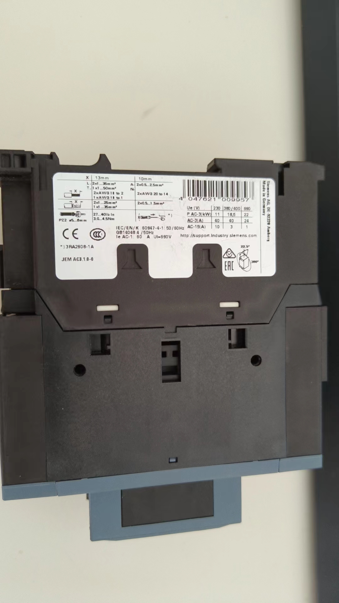 The 3RT2035-3KB40 is a 3 - pole AC contactor from Siemens' SIMATIC 3RT2 series. It has a rated thermal current of 32 A and a rated operational voltage ranging from 220 to 690 V AC (50/60 Hz), suitable for switching loads up to 15 kW at 400 V AC. The coil voltage is 24 V DC, consuming 11 W when holding and 20 VA during in - rush.