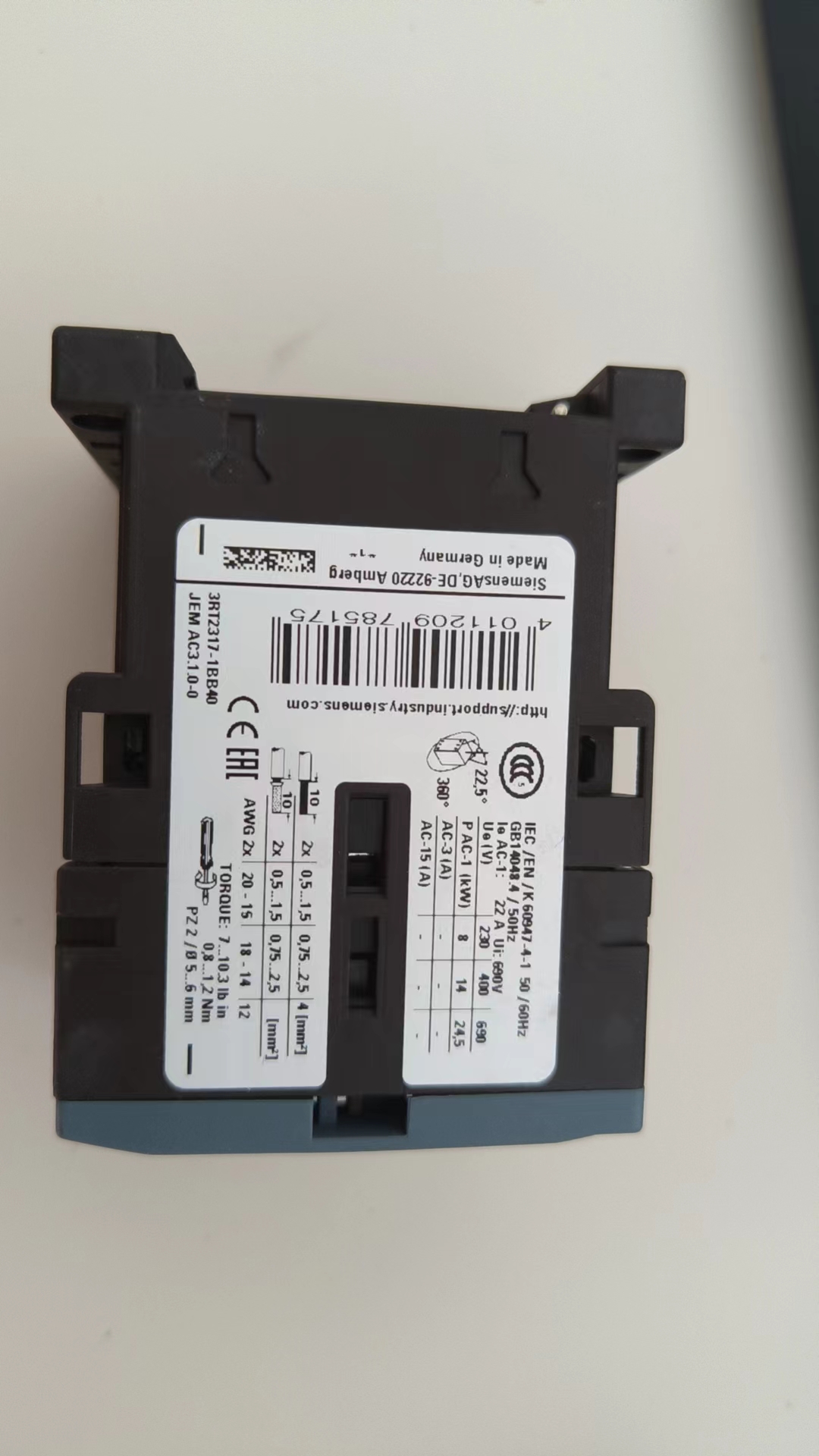 The 3RT2317-1BB40 is a 3-pole motor starter from Siemens' SIMATIC 3RT2 series, integrating a contactor and thermal overload relay. It has a rated thermal current of 17 A and operates at 220-690 V AC (50/60 Hz), suitable for motors up to 7.5 kW at 400 V AC. The 24 V DC coil consumes 11 W (holding) and 20 VA (inrush).