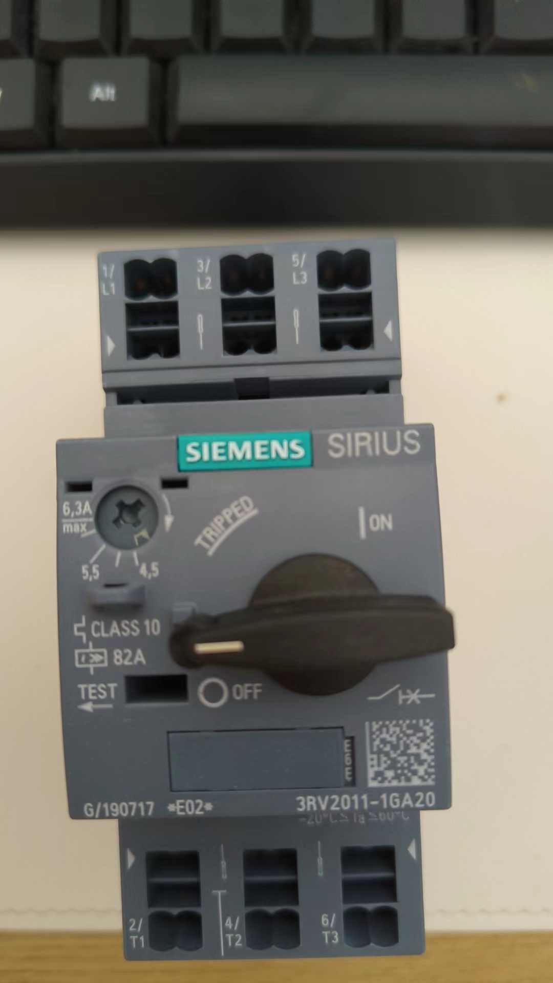 The 3RV2011-1GA20 is a 1-pole thermal-magnetic motor protection circuit breaker from Siemens' SIMATIC 3RV2 series. Rated at 1 A (adjustable 0.63–1 A) for 230 V AC (50/60 Hz), it combines thermal overload protection (delayed trip) with magnetic short-circuit protection (instantaneous trip), offering 6 kA breaking capacity at 230 V AC.