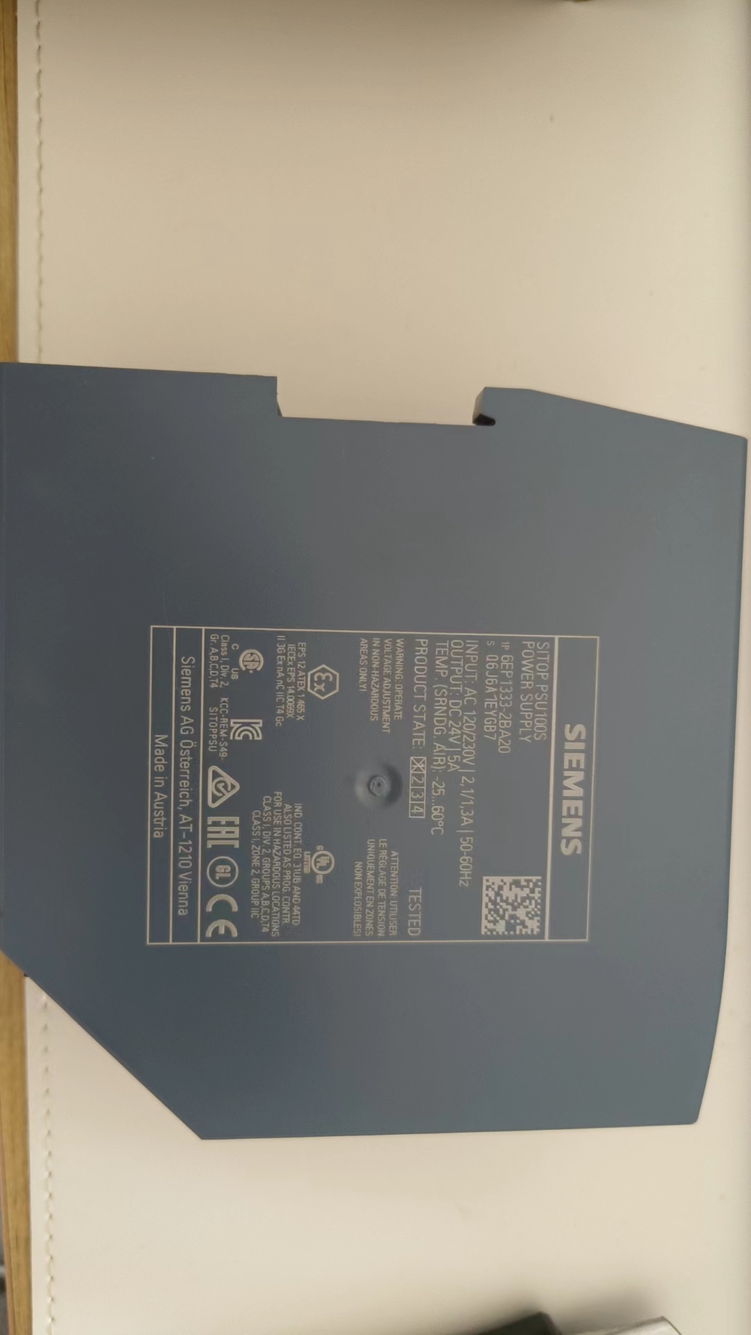 The 6EP1333-2BA20 is a 24 V DC/10 A (240 W) switch-mode power supply from Siemens' SITOP PSU8200 series. It accepts 85–264 V AC (50/60 Hz) or 110–370 V DC input, with adjustable output voltage (21.6–28.8 V DC) and up to 92% efficiency.