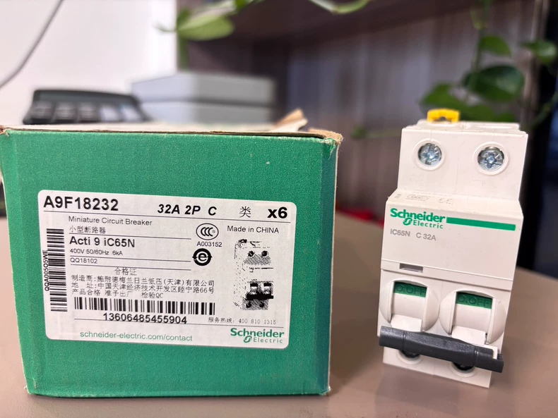 A9F18232 Category: Miniature Circuit Breaker (MCB) Manufacturer: Schneider Electric (Acti9 Series) : Rated Current: 32A Tripping Curve: C Curve (for medium inrush loads) Breaking Capacity: 6kA at 230/400V AC Poles: 1P+N (Single Pole + Neutral) Compact Size: Modular DIN-rail mounting Applications: Residential/Commercial circuits Lighting & socket protection HVAC & appliance control Standards: IEC 60898-1