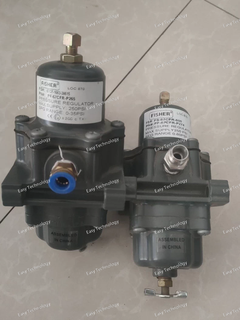 Key Specifications Model: PF-67CFR-P265 Series: 67C Series (67CFR type) Maximum inlet (supply) pressure: up to 250 psi (≈17.2 bar) Outlet (regulated) pressure range: 0–35 psi (≈0–2.4 bar) Connection size: ¼-inch NPT (inlet and outlet) Body configuration: aluminum instrument regulator with internal filter & internal relief Media: Air or compatible gas Temperature/Material notes (general for 67C Series): With Nitrile (NBR) elastomers: operating range typically from –40 °F to 180 °F (≈ –40 °C to +82 °C) With Fluorocarbon (FKM) elastomers: higher temperature capability With Silicone (VMQ) elastomers: for low-temperature service (down to –60 °F / –51 °C) Accuracy / repeatability: In the 67C Series general manual, repeatability for NBR/VMQ elastomers is ~0.1 psi (≈7 mbar) and inlet sensitivity <0.2 psi change in outlet for 25 psi change in inlet (for NBR/VMQ elastomers) Internal relief: The 67CFR type includes built-in relief feature (soft-seat valve) to relieve downstream pressure if it rises above setpoint, thereby ensuring safety & stable regulation Filter: The “F” in 67CFR indicates integral filter—standard polyethylene filter with ~5 microns rating; optional glass or stainless steel filters available Weight: Approximate weight ~0.95 kg (for this particular part)