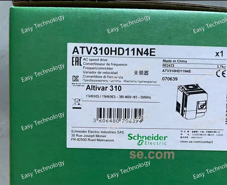 The Schneider Electric ATV310HD11N4E is a heavy-duty variable frequency drive (VFD) from the Altivar 310 series, designed for robust control of three-phase asynchronous motors in demanding industrial environments. This model features an integrated Ethernet port and is engineered to handle high dynamic loads with superior overload capacity, making it suitable for applications requiring reliable performance, advanced motor control, and network connectivity.