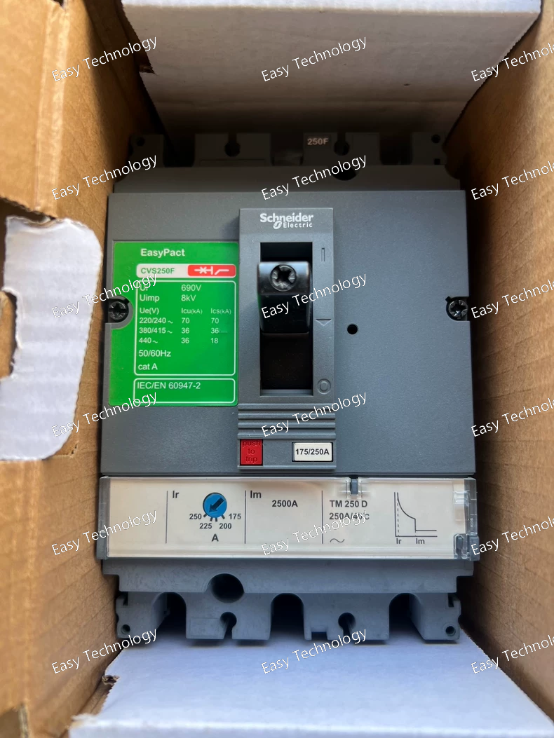 The EasyPact CVS250F is a fixed-mounted 3-pole, 250 A molded case circuit breaker designed for distribution circuit protection against overloads and short circuits in industrial and commercial environments.