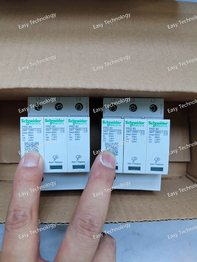 The Schneider Electric PRD 80R 3P is a Type 2 (Class II) Surge Protective Device from the Easy9 / PowerPact PDU series. The "R" version indicates it has a built-in thermal disconnector, eliminating the need for an external backup fuse in standard applications.