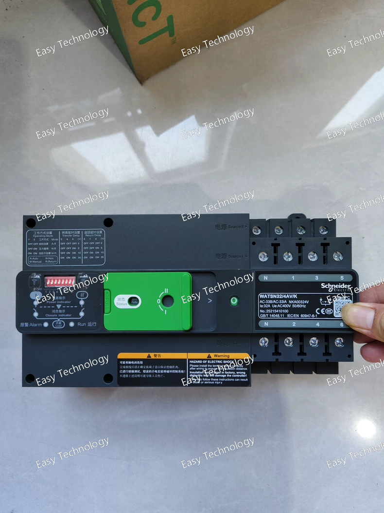 The Schneider Electric WATSN32/4AVK is a 4-pole (3P+N), 32A Automatic Transfer Switch (ATS) from the WATS series. It is designed for reliable, automatic transfer of power between two independent sources (typically Main and Generator) in critical single-phase or three-phase applications. The "AVK" suffix indicates specific features related to its control logic and operation.