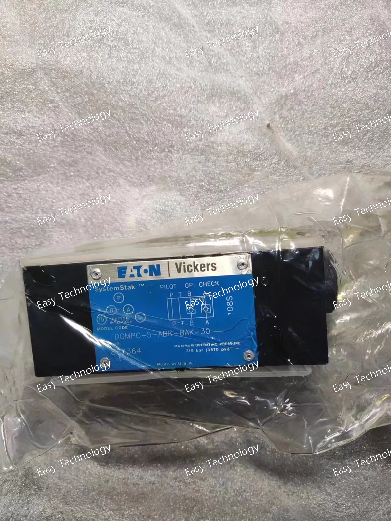 The Eaton DGMPC-5-ABK-BAK-30 is a modular, dual-pilot operated, 4-way directional control valve from Eaton's DGMPC series. It represents a sophisticated and flexible design where main directional control is achieved not by direct solenoid action, but by hydraulic pilot pressure acting on both ends of the main spool. This allows for the control of large flows with a small electrical signal and provides intrinsic hydraulic failsafe features.