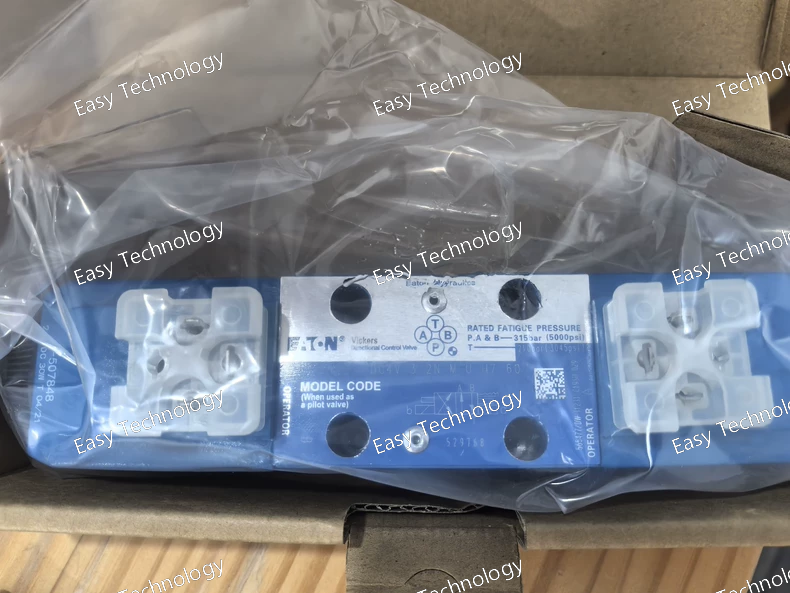Technical Specifications Brand / Series: Vickers by Eaton — DG4V-5 series (20-series design) Model Code: DG4V-5-2AJ-VMU620 Valve Type: Solenoid-operated directional control valve (4-way / 3-way, depending on port/spool configuration) Mounting / Interface: Subplate / manifold mount, ISO 4401-05 (NFPA D05 / NG10) Actuation: Solenoid operated (dual/ single depending on coil config) Electrical Connection: ISO 4400 (DIN 43650) connector Flow Capacity: up to 32 US gpm (≈ 120 L/min) — depending on spool and system conditions Maximum Operating Pressure (Ports P, A, B): 315 bar (≈ 4500 psi) Tank Port Pressure Rating (T port): typically up to 160–210 bar (depending on coil type / spec) Seal Material (standard): Viton (O-rings / seals compatible with petroleum hydraulic oils) Fluid Compatibility: Petroleum-based hydraulic oils Spool Type: 2AJ (closed-center / all ports blocked in neutral, per spool code) Spool Spring Arrangement: Spring-offset (end-to-end) — spring offsets spool toward one end when solenoids are de-energized Manual Override: Plain (standard override in solenoid end only, if equipped) Valve Mount Type: Subplate / manifold mounted (D05 / NG10) Fluid Cleanliness Requirement: 19/17/14 micron code (recommended filtration) Working (Ambient) Temperature Range: from –20 °C (–4 °F) up to about +40 °C (104 °F) for certain coils (for AC coils; DC-coil variants may permit higher ambient) Valve Body Material: Cast gray-iron (robust industrial construction)