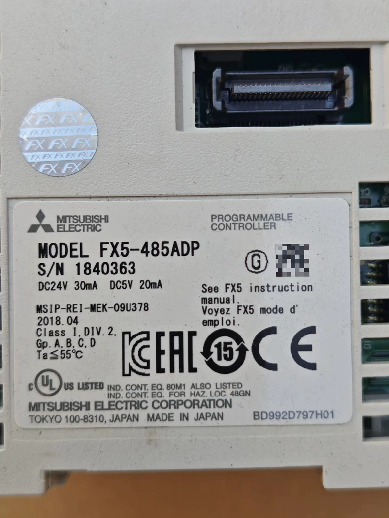 The FX5-485ADP is a compact RS-485 communication expansion module designed for Mitsubishi MELSEC iQ-FX5 series PLCs. It enables high-speed serial communication (RS-422/485) with devices such as inverters, sensors, HMIs, and other PLCs, supporting protocols like Modbus RTU, MC protocol, and custom ASCII communication.