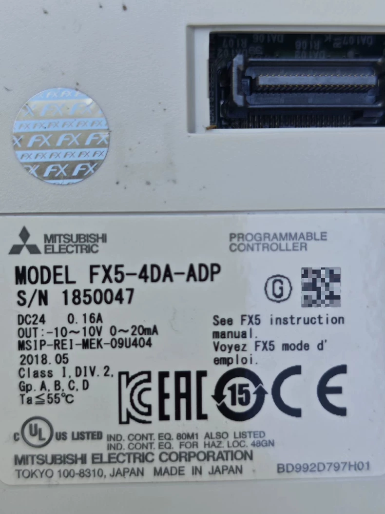 The FX5-4DA-ADP is a 4-channel analog output expansion module designed for Mitsubishi MELSEC iQ-FX5 series PLCs. This compact module provides high-precision analog signal output (voltage/current) for industrial automation control systems, enabling precise control of actuators, inverters, and other analog devices.