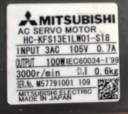 The HC-KFS13E1LW01-S18 is a compact, low-inertia AC servo motor from Mitsubishi's HC-KFS series, featuring specialized specifications (-S18) for demanding industrial applications. This 100W (0.1kW) motor delivers exceptional dynamic response and precise positioning capability, making it ideal for high-speed automation systems.