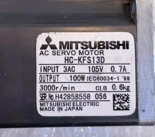 The HC-KFS13 is a 100W (0.1kW) compact servo motor from Mitsubishi's HC-KFS series, designed for precision motion control in space-constrained automation systems. Featuring a low-inertia rotor, this motor delivers exceptional responsiveness for high-speed positioning applications.
