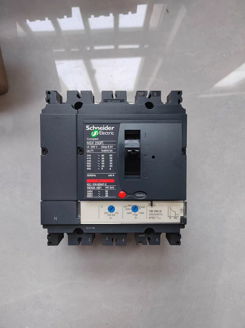 Schneider NSX250F 4P 250A is a low-voltage molded case circuit breaker (MCCB) designed for industrial and commercial power distribution, providing overload and short-circuit protection with 4 poles (L1, L2, L3, N), rated current 250 A, rated voltage up to 690 V AC, and breaking capacity up to 36 kA at 415 V AC.