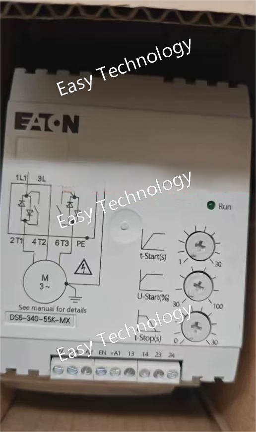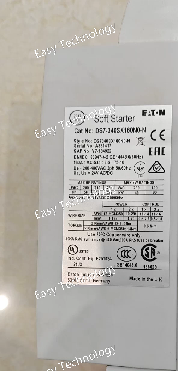 Parameter Specification Product Series Eaton DS7 Model Number DS7-340SX070NO-L Description Soft Starter with Bypass, 340A, 250kW, 400V, 24V Control, LCD Keypad Rated Supply Voltage 400V AC, 50/60 Hz (3 Phase) Motor Power Rating 250 kW (355 HP) @ 400V Rated Current 340 A Current Range Adjustable Control Supply Voltage 24V AC/DC (as set by "SX" code) Integrated Bypass Yes (Internal Bypass Contactor) Keypad Advanced LCD Display (as denoted by -L) Start Control Voltage ramp, Current limit, Torque control Protection Features Overload, Phase Loss, Phase Imbalance, Locked Rotor, Overheating, Undercurrent Communication Optional communication modules (e.g., Profibus DP, DeviceNet, Modbus RTU) Enclosure Rating IP00 (Open Type, must be installed in a control panel) Standards & Certifications CE, cULus, RoHS