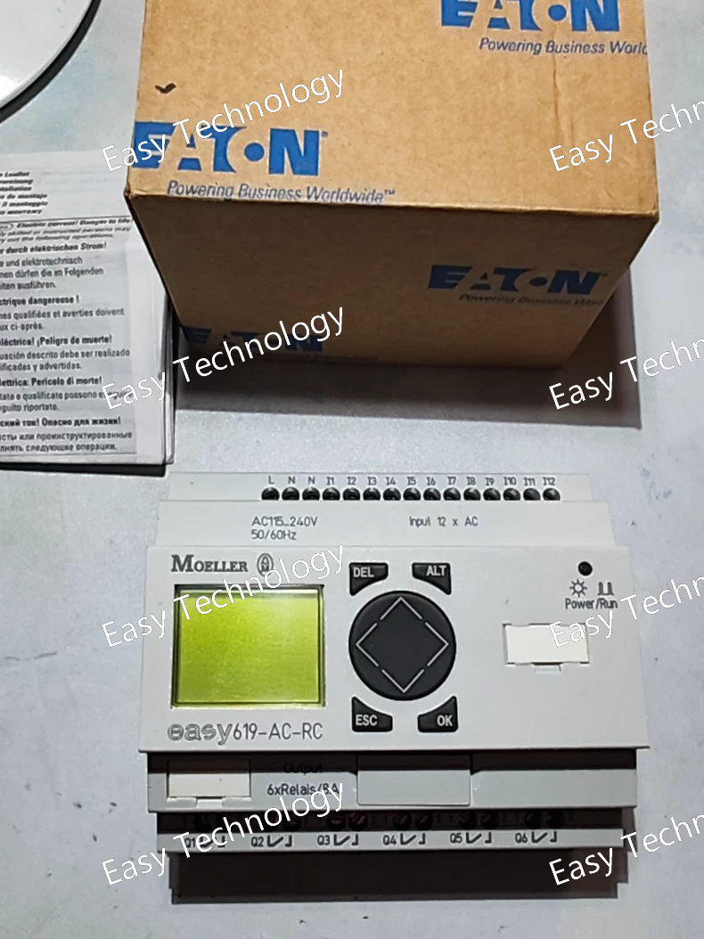 Technical Parameters Parameter Category Specification Product Model EASY619-AC-RC Product Line EASY600 Device Type Programmable Logic Relay (PLR) / Smart Relay Supply Voltage 100-240 V AC (85-264 V AC, 50/60 Hz) Power Consumption Typically 12 W (including loads) Core Processor 32-bit microcontroller User Program Memory 1,000 function blocks (non-volatile) Data Memory 256 flags (non-volatile) Real-Time Clock (RTC) Integrated Digital Inputs 8 x Digital Inputs • 24 V DC (sinking/sourcing) • 2 of them can be used as analog inputs (0-10 V) or high-speed counters (5 kHz) Digital Outputs 6 x Relay Outputs • Switching Capacity: 250 V AC / 30 V DC Max. • 8 A (at 250 V AC Resistive) • 5 A (at 250 V AC Inductive, cos φ=0.4) Analog Inputs 2 x Analog Inputs (shared with 2 digital inputs) • 0 - 10 V DC • Resolution: 10 bit High-Speed Counters 2 x High-Speed Counters (shared with 2 digital inputs) • Frequency: up to 5 kHz Display & Operation Integrated Color Graphic Display (RC) • TFT color screen • 8 function keys with customizable labels Programming Interface Integrated EASY-PC interface (via RJ12 connector) Communication • EASY-LINK: For networking up to 12 EASY400/600/800 devices (via RJ12 connectors). • PC Connection: For programming with EASY-SOFT software. Programming Software Eaton EASY-SOFT (Version 6 or higher recommended) Protection Rating Front panel: IP65 (when mounted) Housing: IP20 Mounting DIN rail mounting (35 mm) Ambient Temperature -25 °C to +55 °C (Operation) -40 °C to +70 °C (Storage) Dimensions (H x W x D) Approx. 126 x 90 x 64 mm