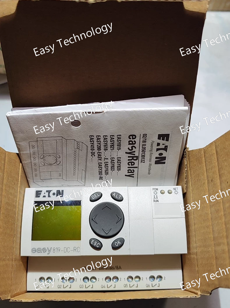 Technical Parameters Parameter Category Specification Product Model EASY819-DC-RC Product Line EASY800 Device Type Programmable Logic Relay (PLR) / Smart Relay Supply Voltage 24 V DC (19.2 - 28.8 V DC) Power Consumption Typically 15 W (including loads) Core Processor 32-bit microcontroller User Program Memory 2,000 function blocks (non-volatile) Data Memory 512 flags (non-volatile) Real-Time Clock (RTC) Integrated (buffered for approx. 80 hours at 25°C) Digital Inputs 8 x Digital Inputs • 24 V DC (sinking/sourcing) • 4 of them can be used as analog inputs (0-10 V, 0/4-20 mA) or high-speed counters (5 kHz) Digital Outputs 6 x Relay Outputs • Switching Capacity: 250 V AC / 30 V DC Max. • 8 A (at 250 V AC Resistive) • 5 A (at 250 V AC Inductive, cos φ=0.4) Analog Inputs 4 x Analog Inputs (shared with 4 digital inputs) • Configurable: 0 - 10 V, 0/4 - 20 mA • Resolution: 10 bit High-Speed Counters 4 x High-Speed Counters (shared with 4 digital inputs) • Frequency: up to 5 kHz Display & Operation Integrated Color Graphic Display (RC) • High-resolution TFT color screen • 8 function keys with customizable labels Programming Interface Integrated EASY-PC interface (via RJ12 connector) & USB port Communication • EASY-LINK: For networking up to 12 EASY800 devices • Ethernet (optional module): For integration into plant networks and remote access. • PC Connection: Via USB or RJ12. Programming Software Eaton EASY-SOFT (Version 7 or higher recommended for full color display support) Protection Rating Front panel: IP65 (when mounted) Housing: IP20 Mounting DIN rail mounting (35 mm) Ambient Temperature -25 °C to +55 °C (Operation) -40 °C to +70 °C (Storage) Dimensions (H x W x D) Approx. 126 x 90 x 64 mm