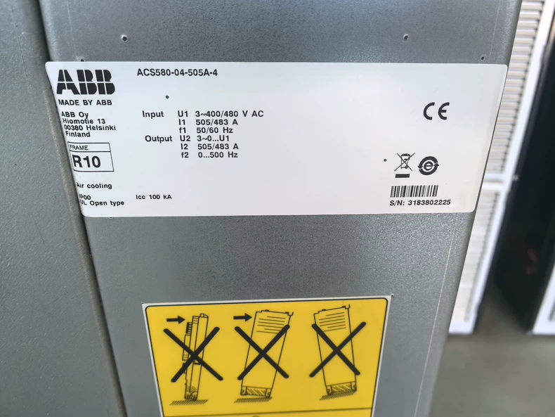 Key Specifications Power Rating: 500 kW (670 HP) Input Voltage: 3-phase 380–500V AC (±10%), 50/60 Hz Output Current: 850 A Overload Capacity: 110% continuous, 150% for 60s Control Method: Sensorless Vector Control (DTC option available) Efficiency: >98% Switching Frequency: Adjustable (2–8 kHz) Main Features ✔ Advanced Motor Control Sensorless vector control for precise speed regulation Automatic motor adaptation (AMA) for optimal performance Flying start and torque boost functions ✔ Built-in Application Macros Pre-programmed settings for pumps, fans, conveyors, and compressors Customizable logic with PID controller (for pressure/flow control) ✔ Protection & Safety Motor thermal protection (PTC/KTY support) Short-circuit, overvoltage, and ground fault protection Safe Torque Off (STO) for emergency stop compliance ✔ Connectivity & Communication Standard RS485 (Modbus RTU) Optional fieldbus modules (Profibus, Ethernet/IP, Modbus TCP) ABB Drive Composer software for easy configuration ✔ User-Friendly Interface Integrated keypad with LCD display Quick setup with assisted startup wizard Parameter backup via USB Physical & Environmental Specifications Enclosure Rating: IP21 (open chassis) Cooling Method: Forced air cooling (fans included) Ambient Temperature: 0–40°C (32–104°F) without derating Dimensions (W×H×D): 800 × 1800 × 400 mm Weight: Approx. 200 kg