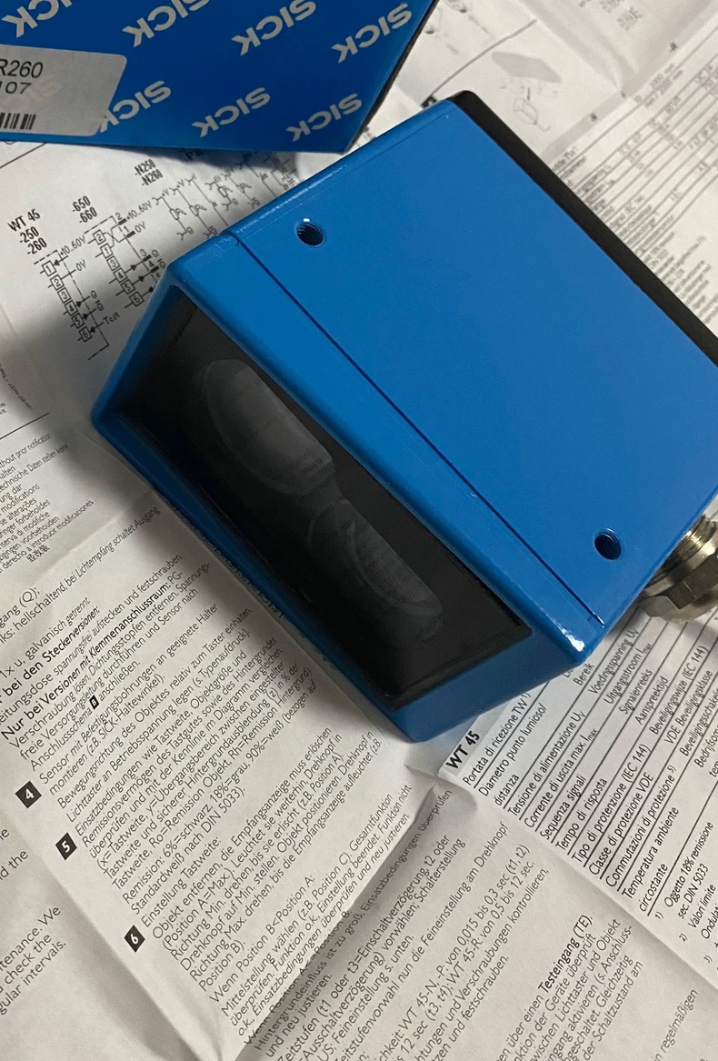 The SICK WLG4S-3P2232VS03 is a compact, stainless-steel retro-reflective photoelectric sensor with a visible red PinPoint LED (650 nm). It supports object detection up to 5 meters without a reflector using autocollimation optics. The sensor features a lockable teach-in button, a rugged IP66–IP69K washdown-ready housing, fast response (< 0.5 ms), and a PNP output with light/dark switching, making it ideal for demanding hygienic and transparent-object detection applications.